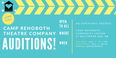· CAMP Rehoboth Theatre Auditions: Two new shows this fall (Raincheck, and The Weir) are holding auditions August 7–9 at CAMP Rehoboth. Check out https://www.camprehoboth.com/arts/camp-rehoboth-20222023-season for more information on the shows, show dates, and roles available.