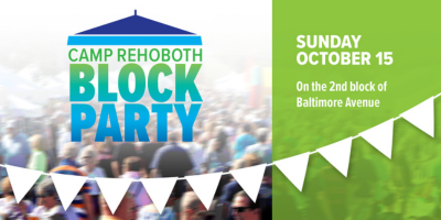 · Block Party 2023: The CAMP Rehoboth Block Party returns on Sunday, October 15, 11:00am to 4:00pm for festive fun and a day-long street festival with music, special performances, vendors, street food, and more! Vendor registration and sponsorship opportunities are available at camprehoboth.com/blockparty.