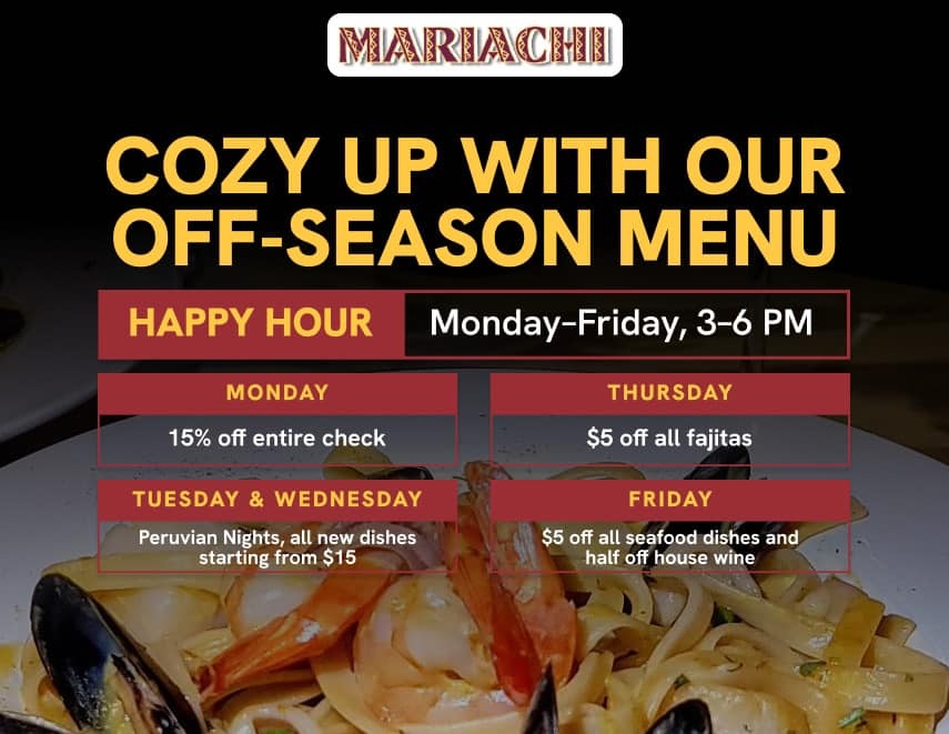 Mariachi offers brunch on weekends and has a happy hour available Monday through Friday from 3 to 6 PM. During the off-season, there are nightly specials: Monday is 15% off your bill; Tuesday and Wednesday are Peruvian nights featuring new dishes starting at $15; Thursday features $5 off all fajitas; and you can celebrate the end of the week on Friday with half-price house wines and $5 off all seafood dishes.